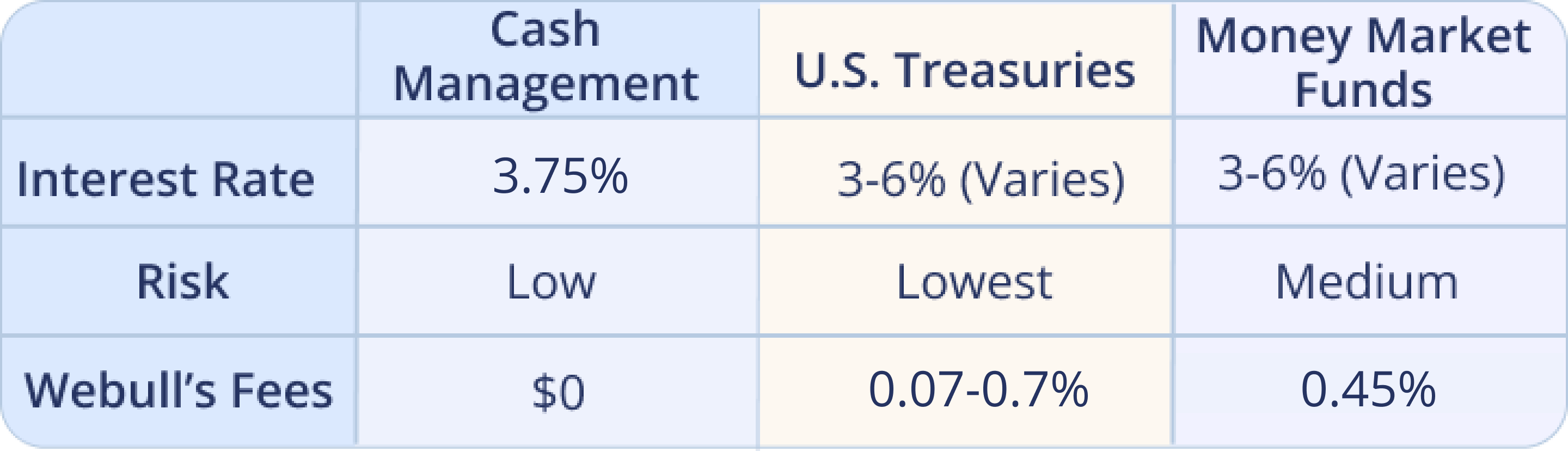 At Webull, Cash Management is a place to earn interest on uninvested cash you're not currently using, and lets you earn 3.75% APY on any idle cash.