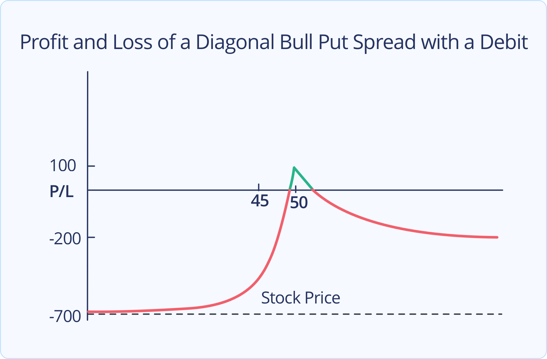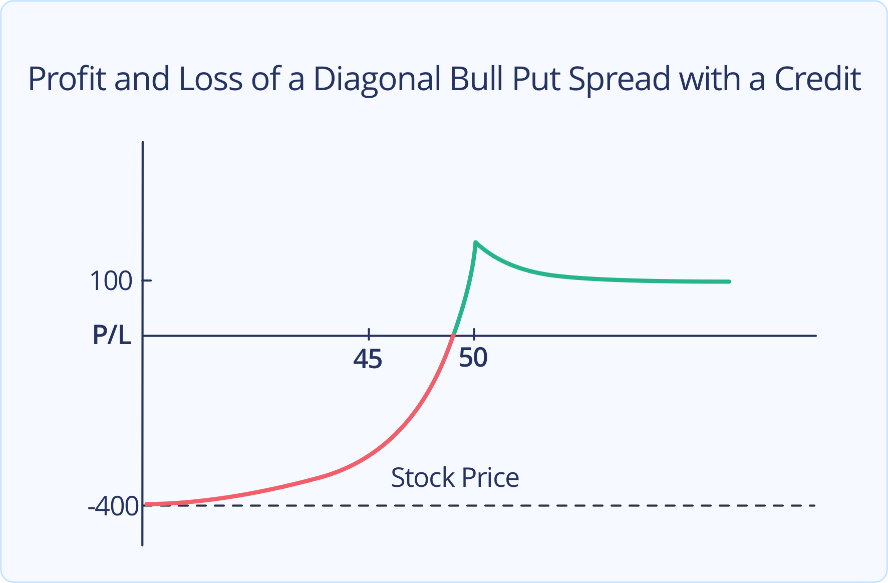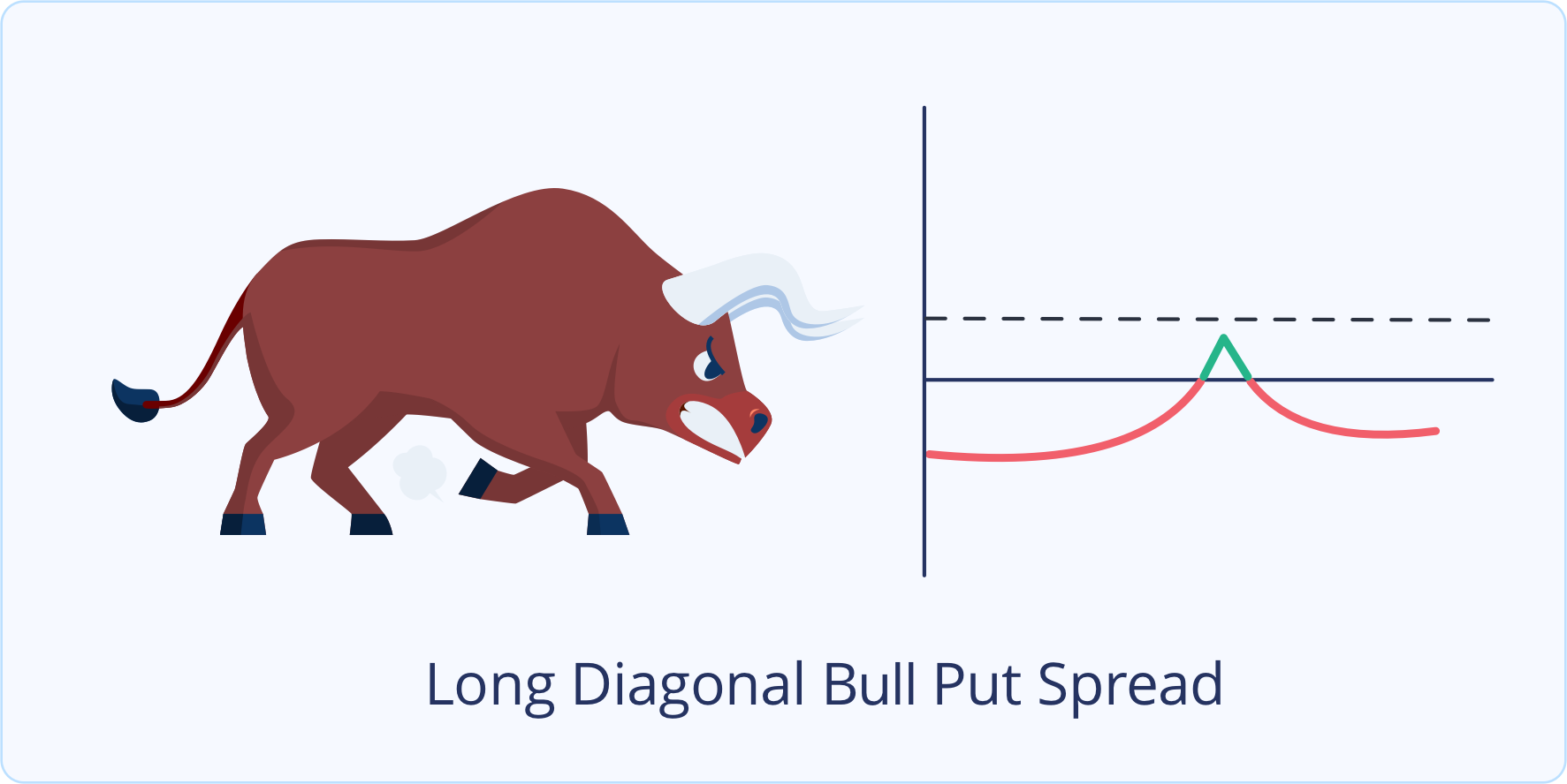 A diagonal bull put spread is typically constructed by selling an out-of-the-money put and buying a further out-of-the-money put with a longer-term expiration date. The credit earned by selling the near-term put option helps offset the debit paid to buy the long-put option, leaving you with a lower debit or even a net credit.