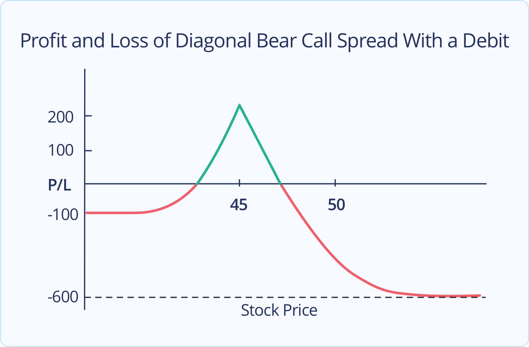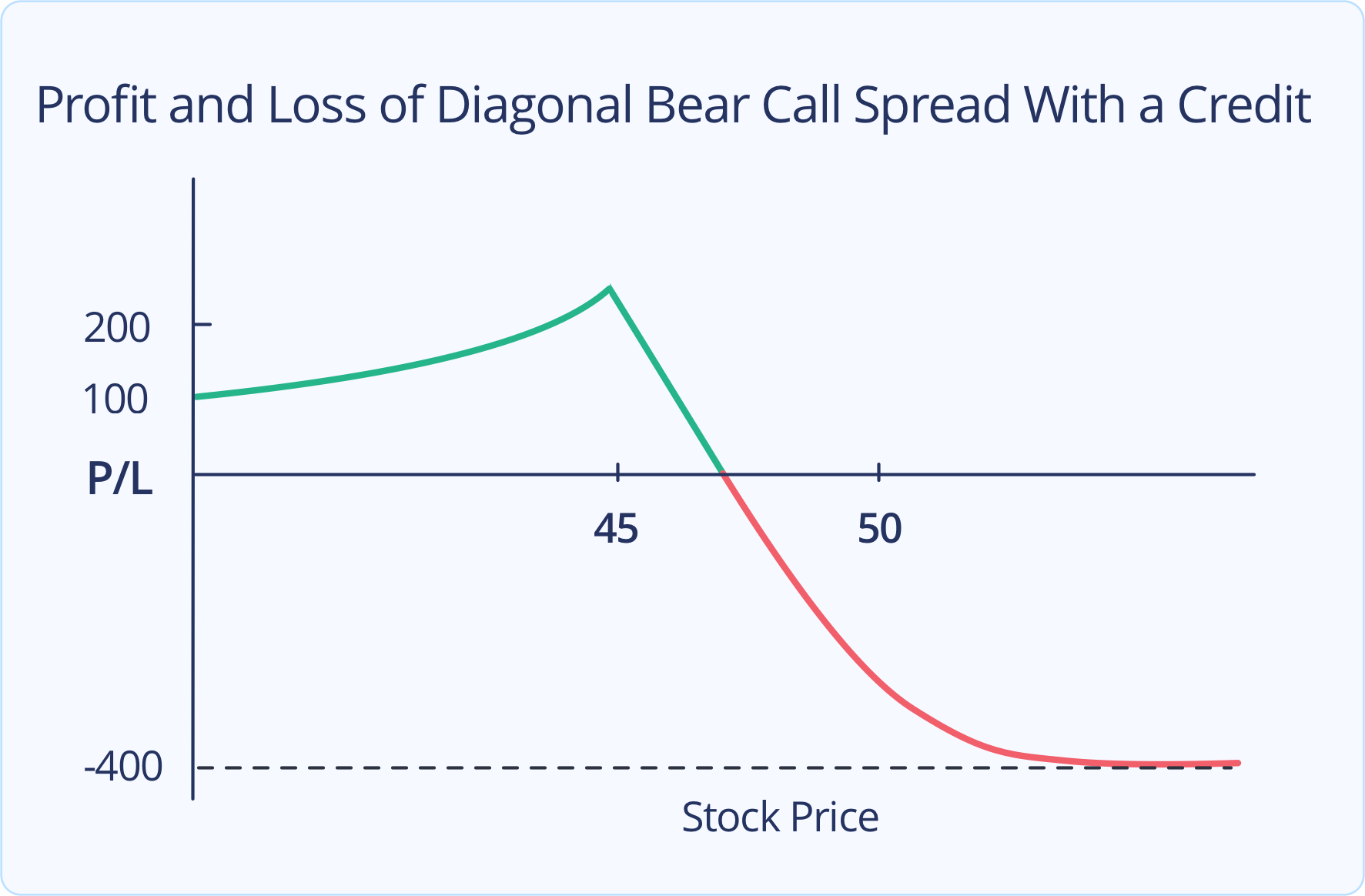Pictured below are two different graphs of a diagonal bear call spread, one which opens the position with a credit, and one with a debit. Whether there is a credit or debit at opening is determined by two factors: the width of the spread between the strike prices and the time until expiration for the two contracts. A narrower spread usually results in a lower credit or even a debit, as the long option is closer to the money and more expensive to open. For the same reason, the time until expiration of the contracts also affects whether a credit or debit is established. The more time there is left until expiration on the long option, the more expensive it is to open that leg of the position, resulting in a lower credit or possibly a debit.