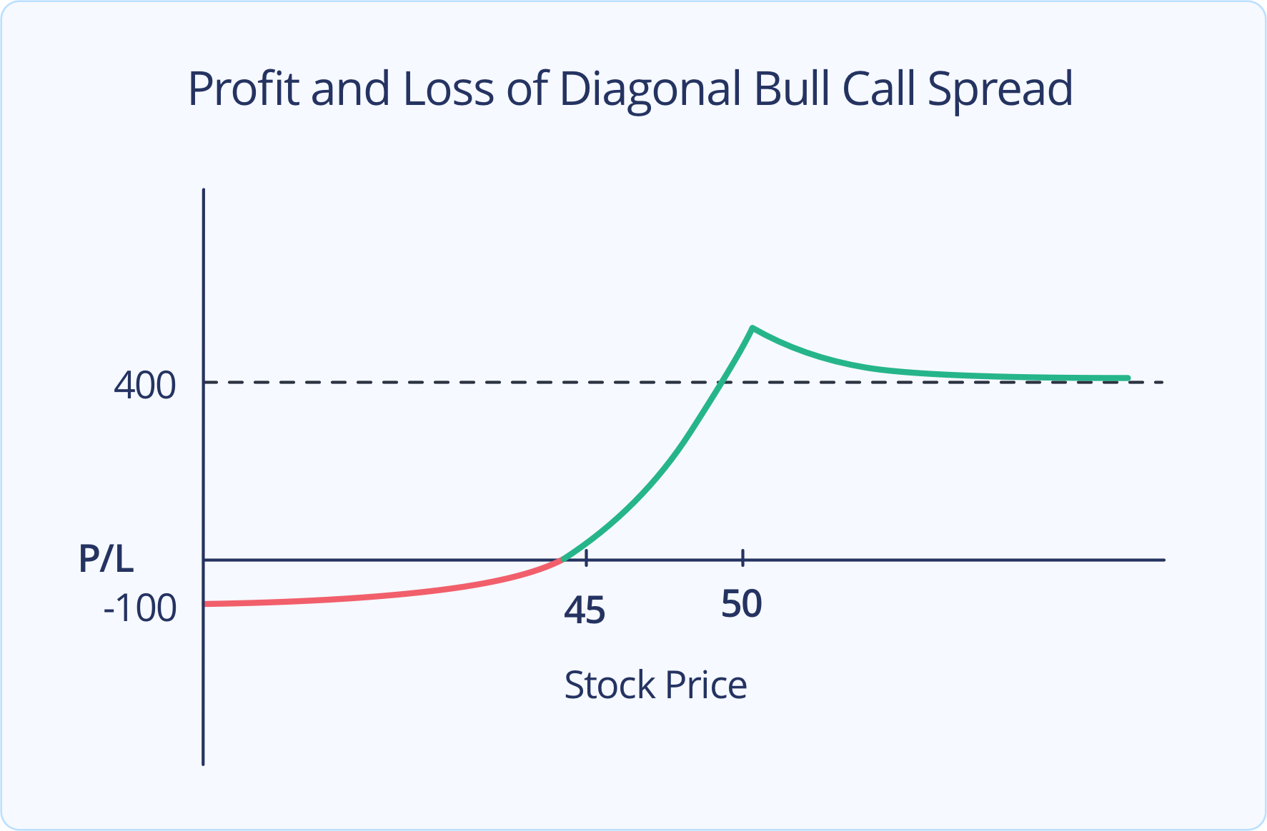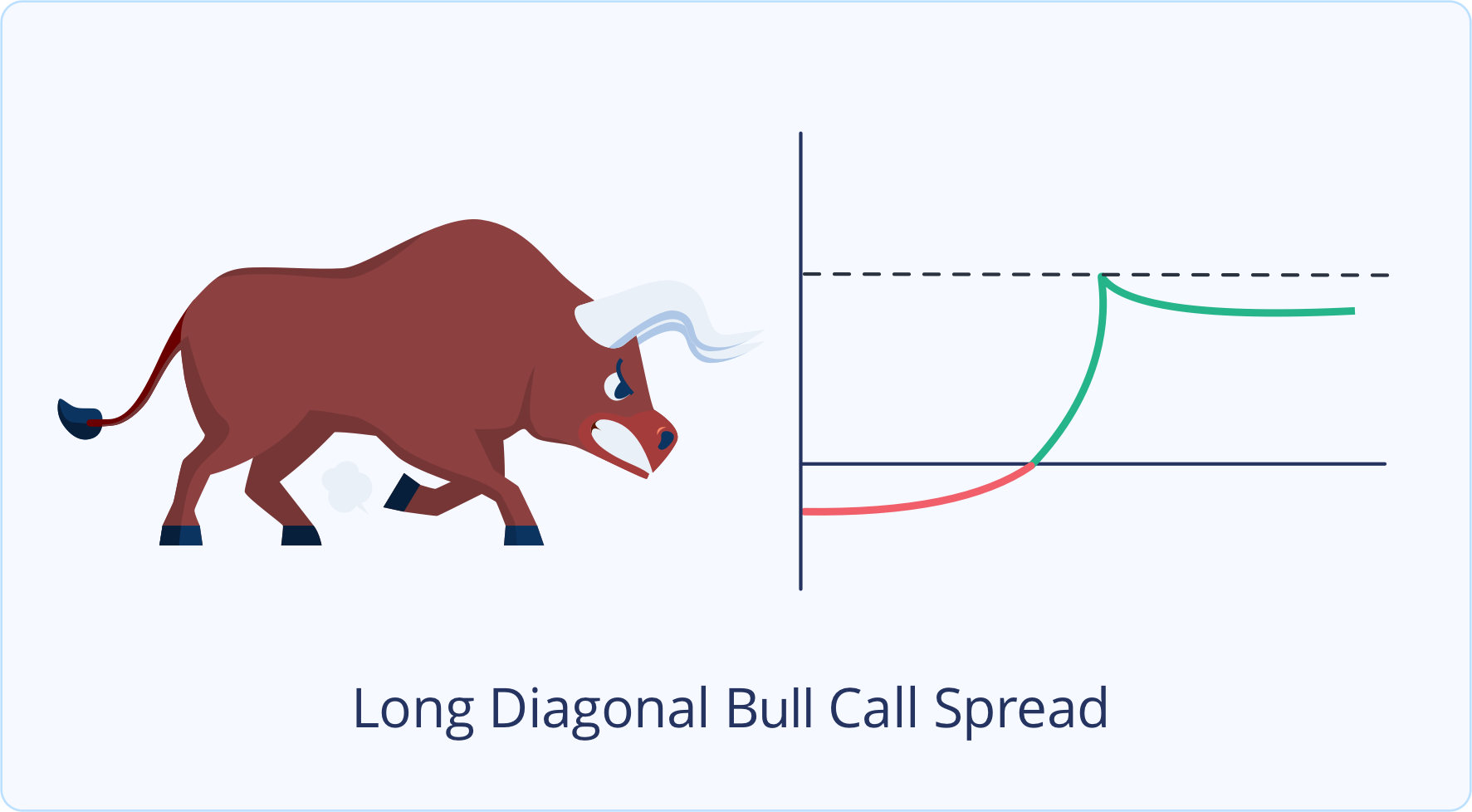 A long diagonal bull call spread is constructed by buying an out-of-the-money call and selling a further out-of-the-money call with a shorter-term expiration date. The credit earned by selling the near-term call option offsets the debit paid to buy the long call option.