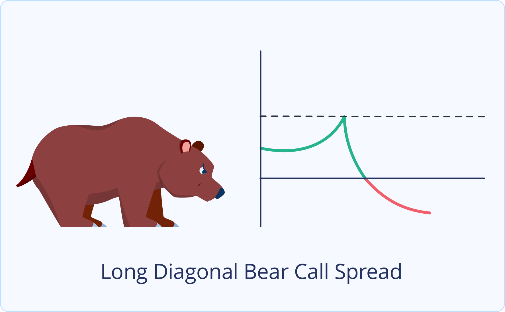 A long diagonal bear call spread is generally set up by selling an out-of-the-money near-term call and buying a higher strike call with a later expiration date. The credit earned by selling the near-term call option offsets the debit paid to buy the long call option.