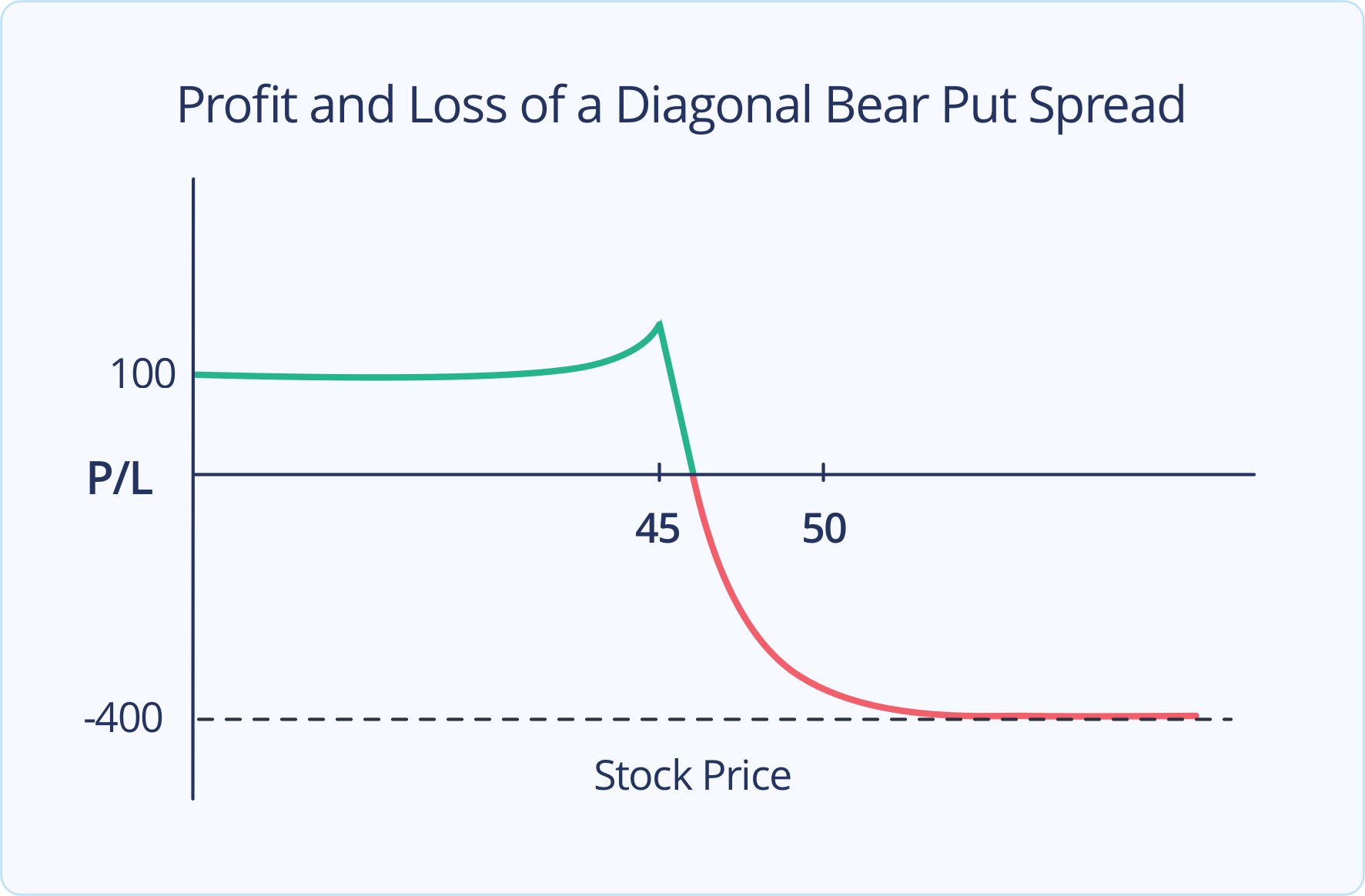 A diagonal bear put spread is typically constructed by buying an out-of-the-money put and selling a further out-of-the-money put with a shorter-term expiration date. The credit earned by selling the near-term put option helps offset the debit paid to buy the long-put option, leaving you with a lower net debit.