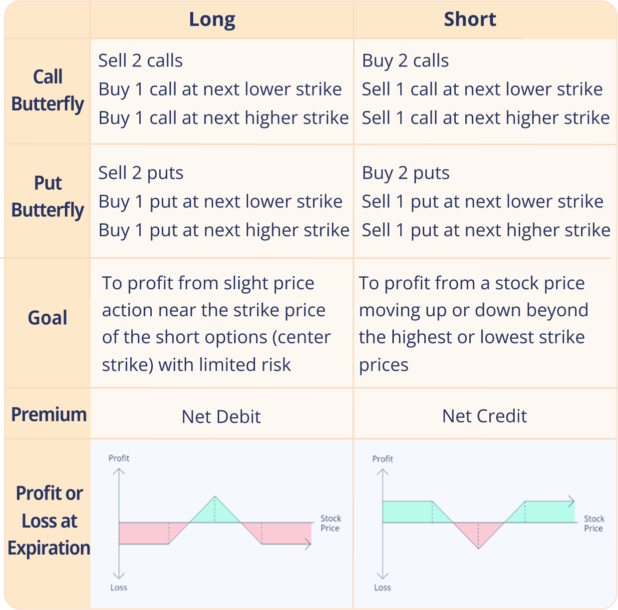 A butterfly is a three-part option strategy consisting of a long vertical spread and a short vertical spread with the same expiration date. The short option in the long spread, and the short option in the short spread, must have the same strike price. Both call options and put options can be used for a butterfly spread. A quick guide to butterfly strategies is shown below.