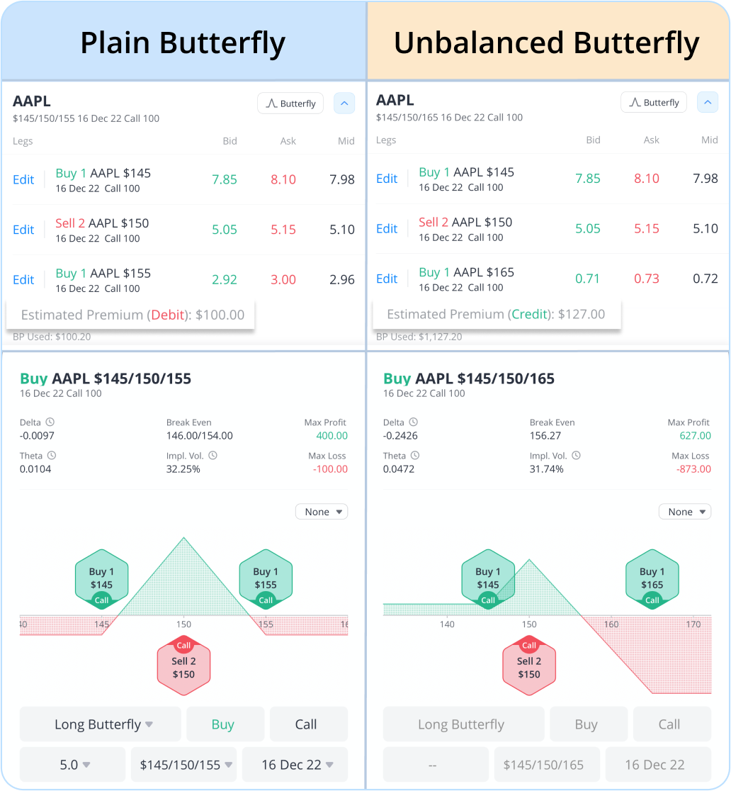 Take the long call butterfly as an example. Suppose AAPL is trading at $148. Instead of holding a 100 percent neutral attitude, the butterfly holder believes the probability of the stock price going up is relatively lower than moving downwards (more bearish), as the stock is nearing its resistant level. The broken-wing butterfly could be a better fit for this trader. If you opt for a higher-strike, lower-premium long option on the right wing of the spread, in some cases you can convert the position from a net debit to a net credit, but this carries its own risks. You may end up with a long stock position after expiration in some scenarios.