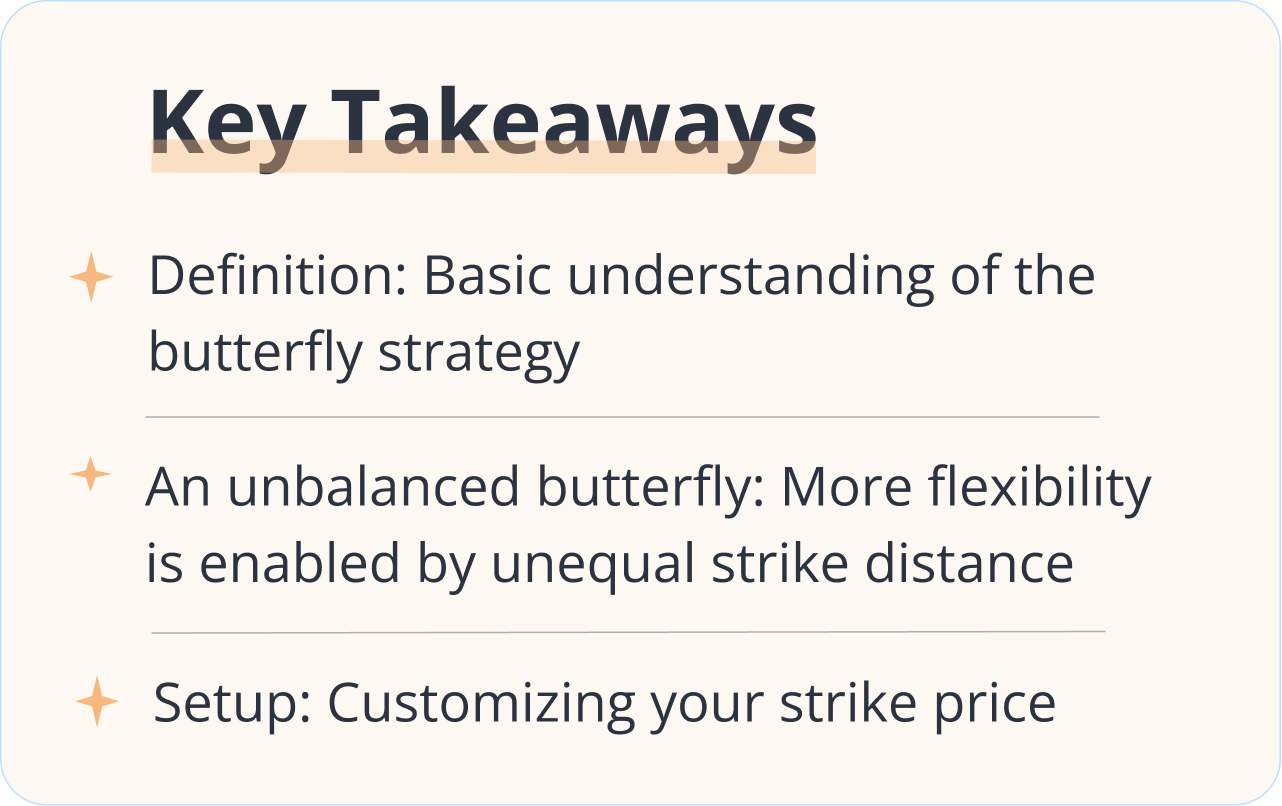 Compared to the plain butterfly option position, the unbalanced butterfly allows the selection of strike prices at unequal intervals between options, providing more flexibility. If the distance between the long option and short option is not the same, then the butterfly will have a “broken wing,” as the two spreads—the “wings” of the butterfly—are not balanced.