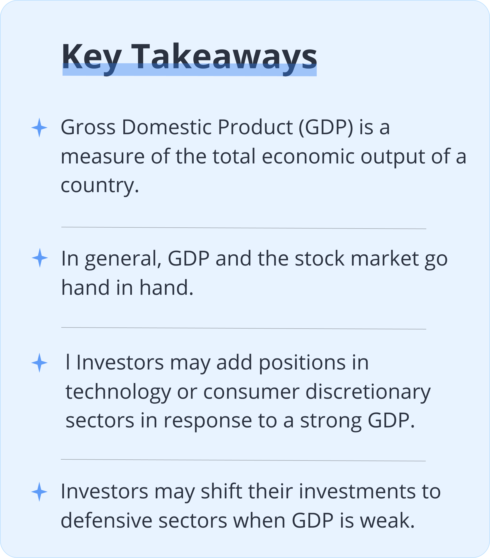 GDP measures the overall health of the economy and implies where the stock market is heading. A strong GDP indicates a strong economy and may imply a positive market outlook. A weak or negative GDP indicates slow economic growth and may be a warning of recession.