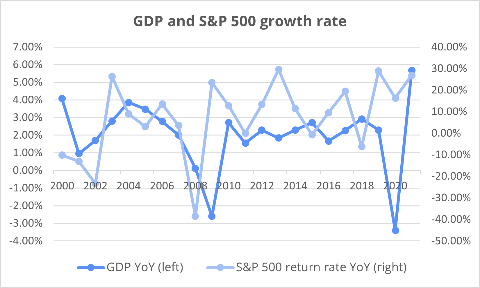 The chart below shows the annual GDP and S&P500 index return rate from 2000 to 2021. In general, the two parameters go hand in hand despite a few divergences.