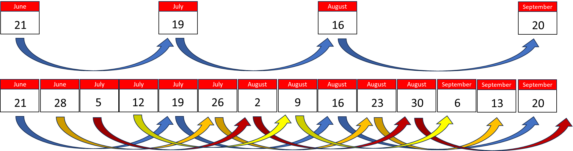 The Bull Strangle strategy leverages monthly and weekly options sold in 4–5-week cycles.  Weekly options enables a continuous (more diversified) expiration cycle.