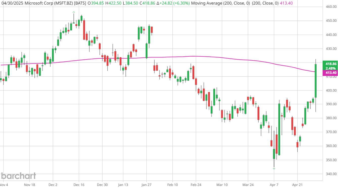 The market has responded positively to these results, with MSFT stock rising more than 5% in after-hours trading to around $417 per share. That puts Microsoft on pace to challenge its 200-day moving average in Thursday’s session, which hasn’t been toppled on a daily closing basis since the stock’s Jan. 29 post-earnings bear gap.