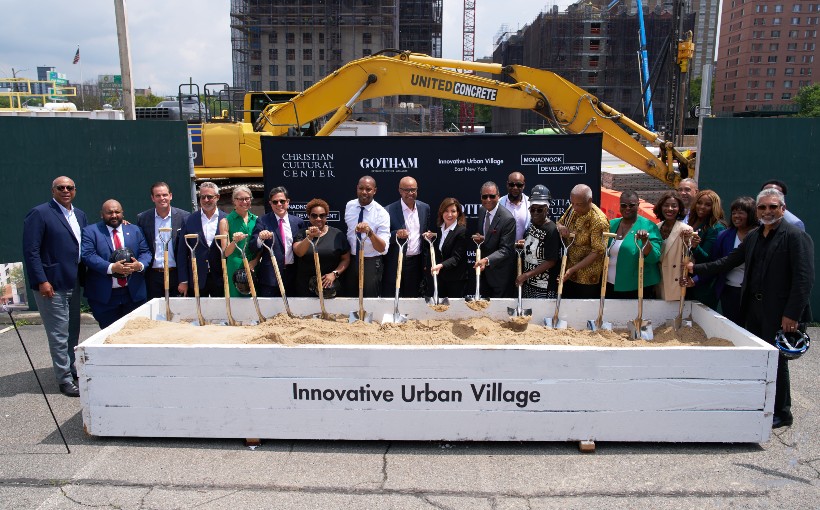 Construction is underway at Innovative Urban Village Phase 1A, a 385-unit affordable housing development with commercial space for a fresh food grocery store in the East New York neighborhood of Brooklyn. The $270-million project is part of the comprehensive redevelopment of the Christian Cultural Center’s campus, which ultimately will include a total of nearly 2,000 affordable apartments in 10 buildings.