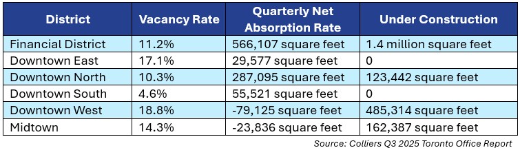 Toronto’s downtown office vacancy rate was approximately 1.1%% in Q4 2019. Moving through COVID and the aftermath years, the downtown vacancy rate in Q3 2025 stood at 12.6%, according to Colliers.