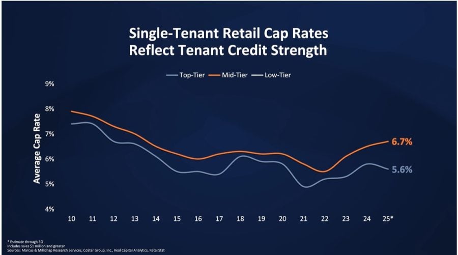Cap rates on NNN assets with high creditworthy tenants have been in the mid-5% range. Properties leased to mid-tier tenants trade in the high 6% range, while the cap rate for properties containing lower-tier credit tenants is in the 7% range.