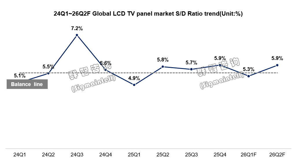 In the first quarter of 2026, panel manufacturers' strategic production control is expected to drive the balance between supply and demand in the TV panel market. Looking at the demand level, the demand volume may decrease both year on year and month over month due to the interaction between moving demand and preparing goods for the event, but the optimization of the size structure provides some support for the demand area. From a supply perspective, leading panel manufacturers are determined to control production and stabilize prices, so it is possible to increase production control efforts during the Spring Festival to hedge against cooling demand. #根据群智咨询 “Supply and Demand Model” calculation data (area benchmark) shows that the global LCD TV panel market's supply-demand ratio in the first quarter was 5.3%, and the balance between supply and demand was slightly tight. Taken together, in the context of the high concentration of LCD TV panels giving panel manufacturers a stronger voice, panel makers' implementation of production control and price stabilization strategies and strong demands for price increases are expected to have a butterfly effect on some machine manufacturers, or may drive LCD TV panel prices to rise partially.