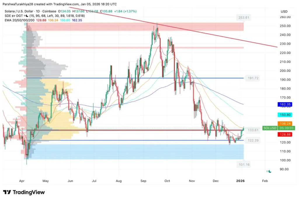 SOL is up over 2%, breaking above the 20 EMA at $128.88 after defending the critical $120-$122 support zone through multiple December tests.