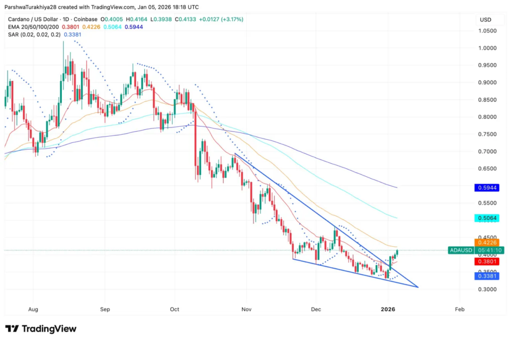 After bottoming near $0.35 in late December, ADA pierced through the wedge’s upper boundary and is now testing the 20 EMA at $0.38.
