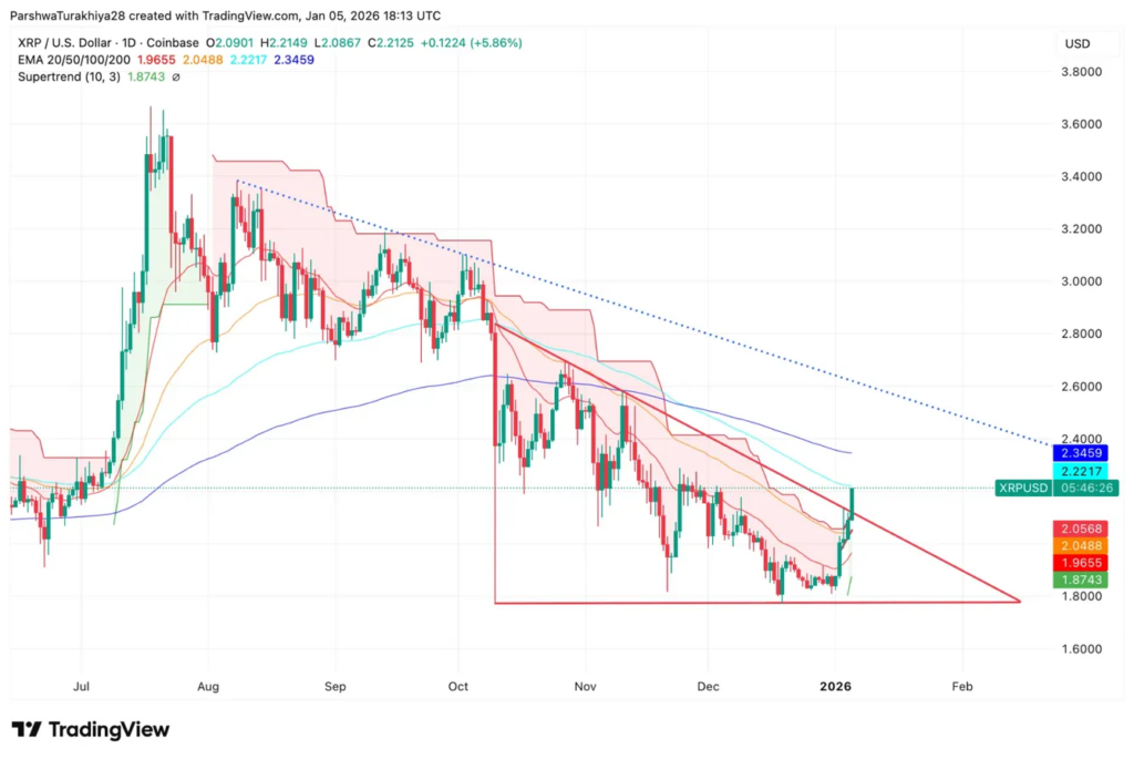 XRP successfully reclaimed critical support at $1.8 and broke above the 20 EMA at $1.97, 50 EMA at $2.05, and is now testing the 100 EMA at $2.22.